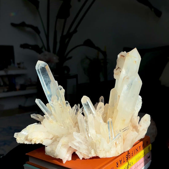 Extra Aesthetic Formation! This mine is currently closed, therefore a specimen like this one is extremely rare. Extra long DNA Blue Smoke Lemurian Quartz crystals with a subtle Golden Healer hue (limonite).