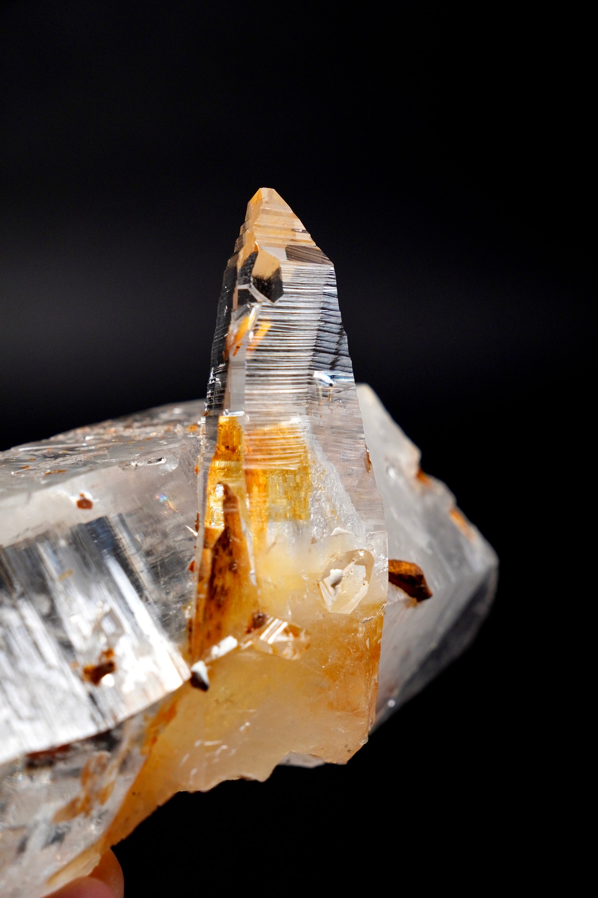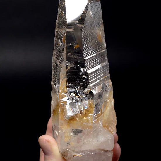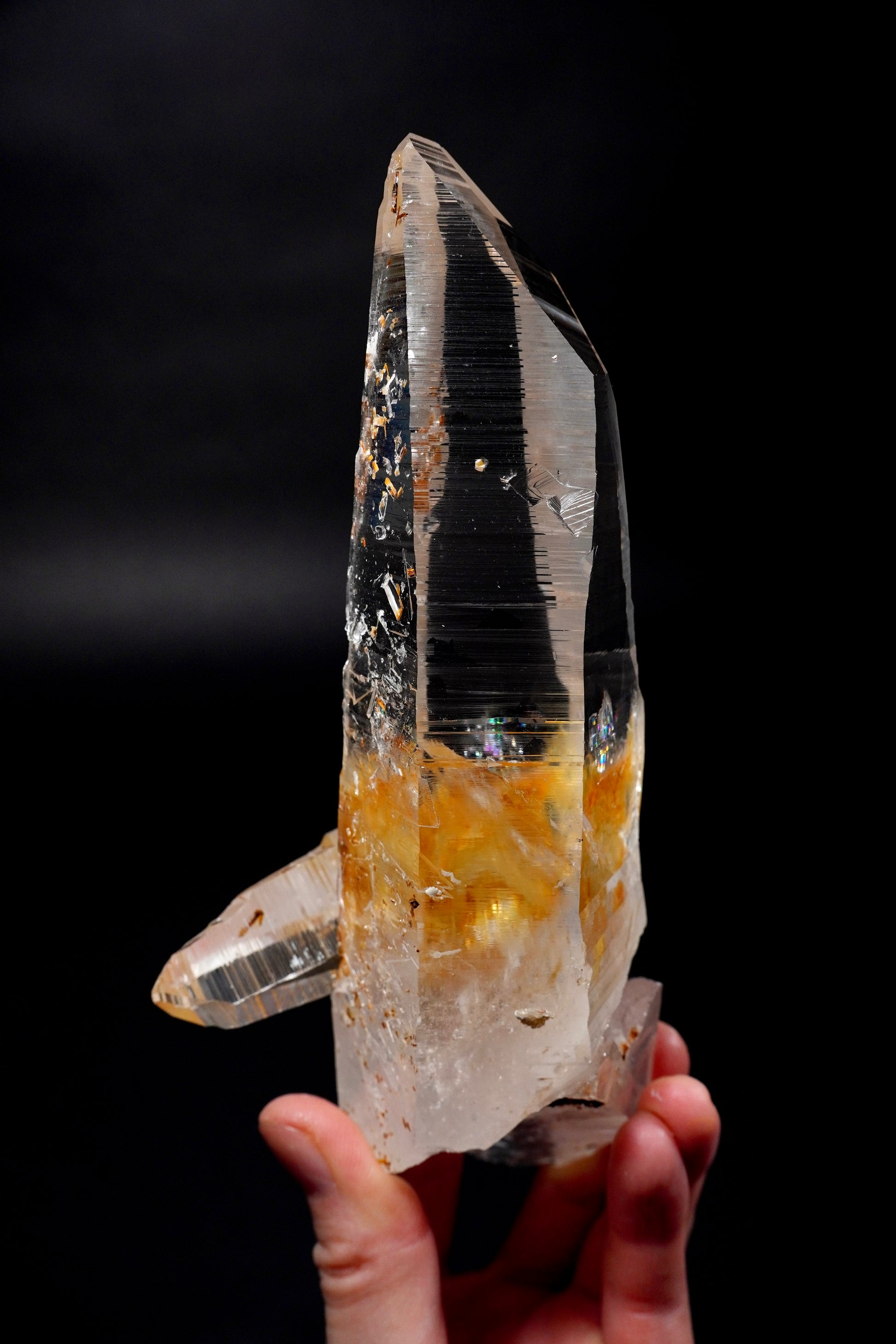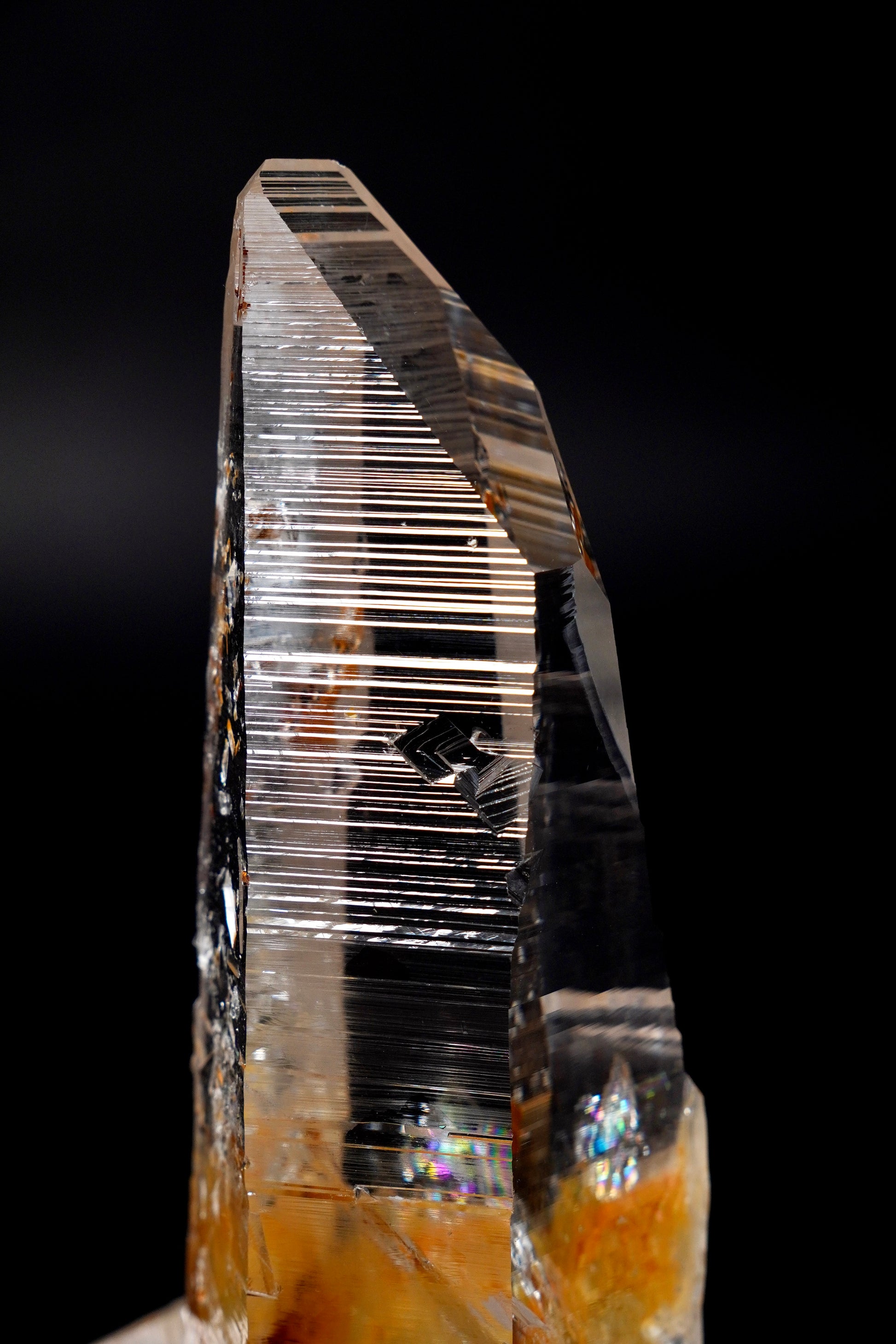 Golden Healer Sword of Light with a time window to the Future, a Laser growing on the side, deep striations, rainbow inclusions and a perfect chisel termination.