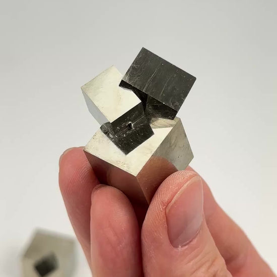 These unique pyrite specimens features intergrown crystal cubes, naturally connected in a fascinating intertwining pattern. These high-quality minerals boast a flawless surface and a brilliant golden shine.
