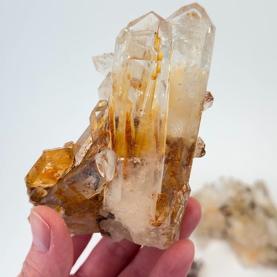 Born from the depths of the Andes and shaped by ancient volcanic forces, this rare Lemurian Quartz variety awakens with thick, lustrous points and blazing Dragon Fire inclusions — a mesmerizing fusion of golden, red, and ember-like tones flowing within crystal-clear blades. ✨🔥
