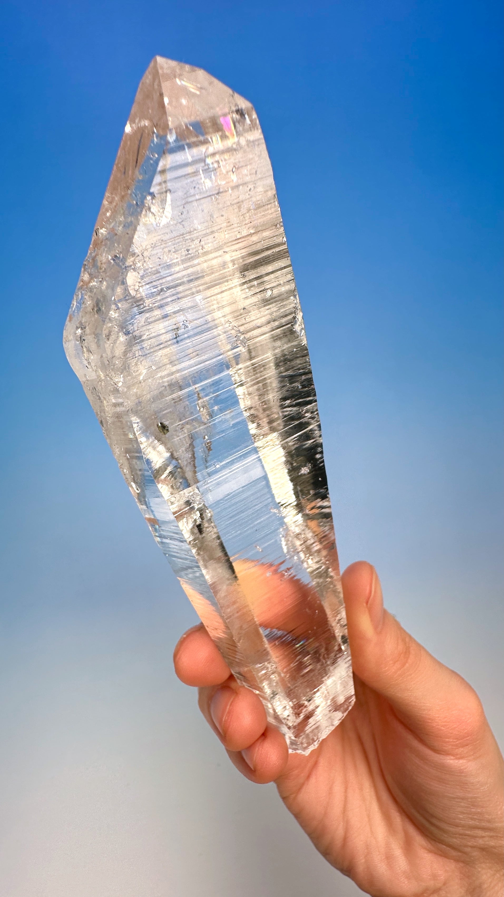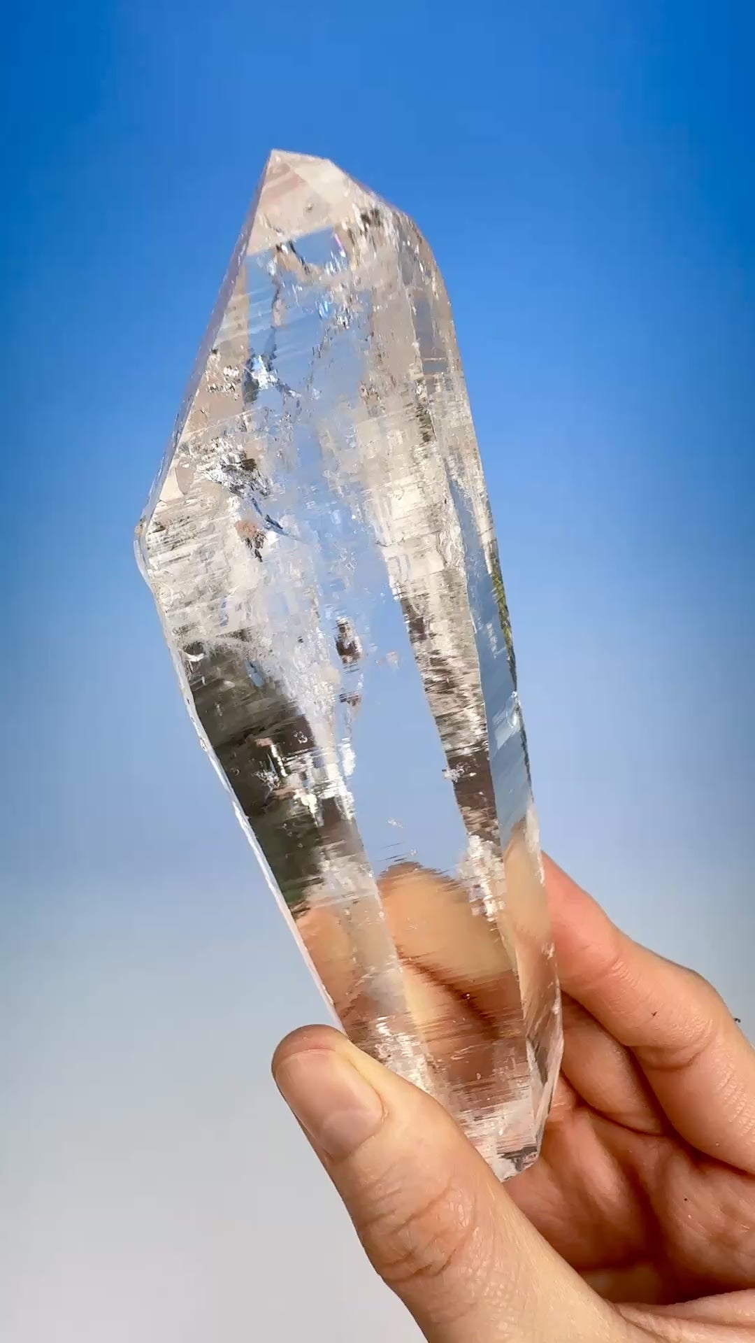 Among the rarest Lemurian Quartz formations on Earth, this powerful healing Scepter radiates with exceptional clarity and a mesmerizing wet lustre.