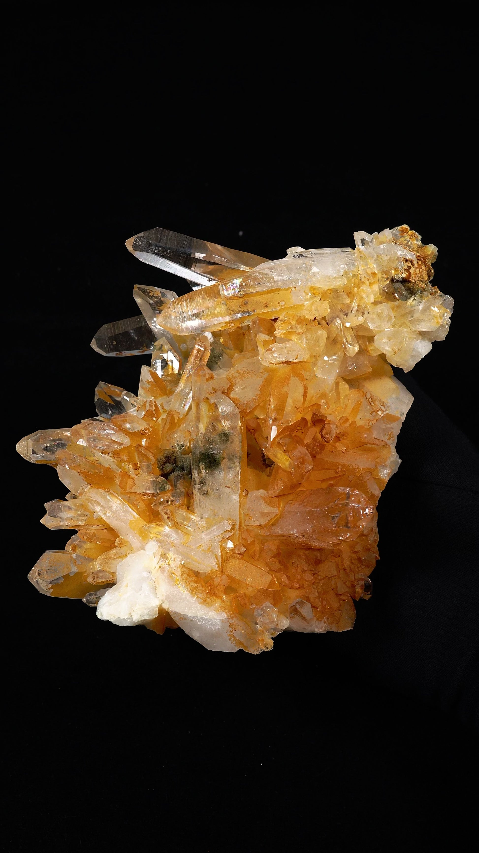 Extra Aesthetic Formation! This is a super rare finding, the Lemurian Quartz Points are naturally covered by a Golden Iridescent Iron Oxide and center of this beautiful cluster is included with deep forest green clinochlore. A super funky specimen for an authentic collector ✨