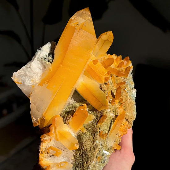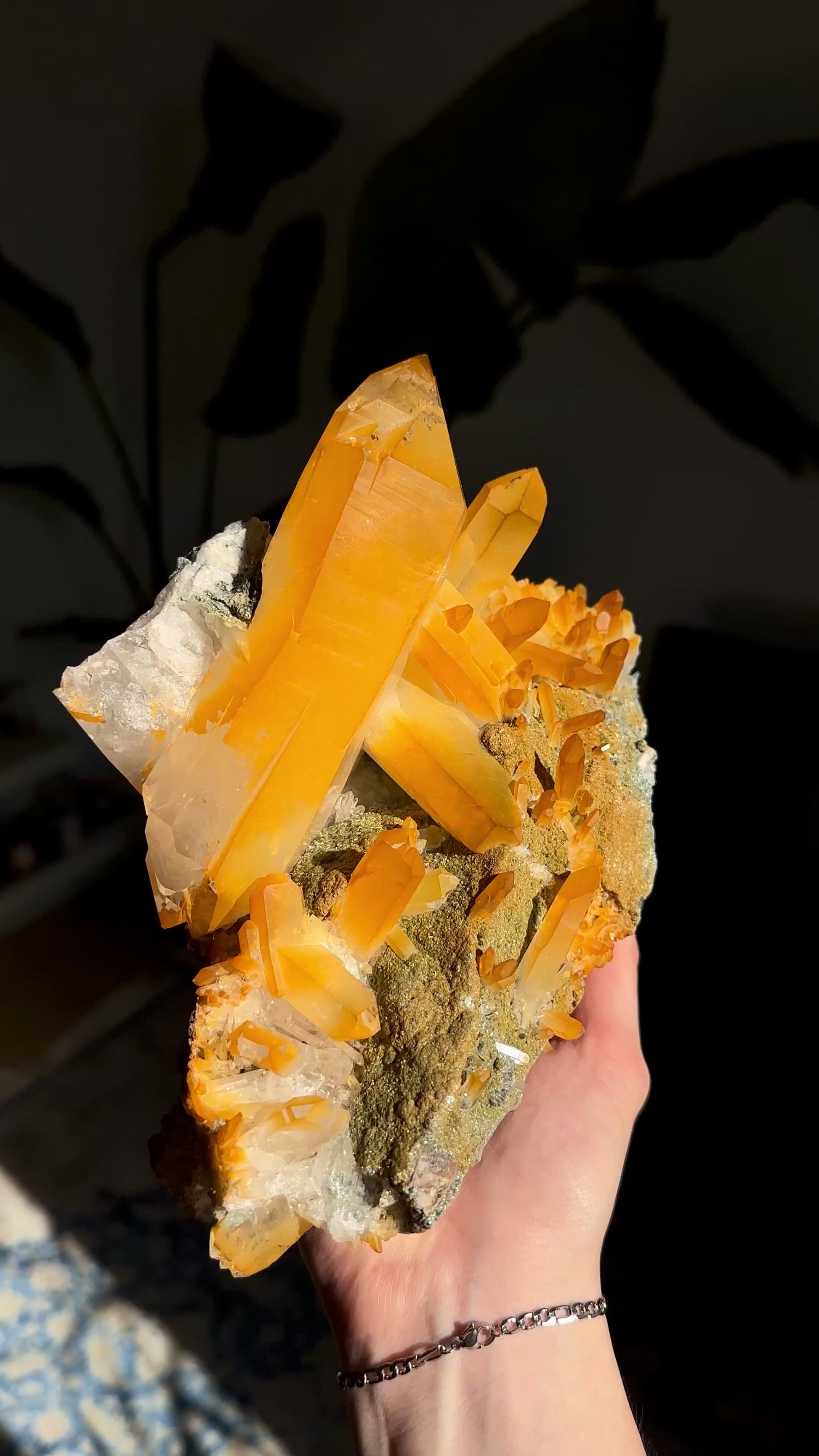 Extra Aesthetic Formation! This is a super rare finding, the Lemurian Quartz Points are naturally covered by a Golden Iridescent Iron Oxide and base of these mysterious clusters is covered by velvety green fuchsite. A super funky specimen for an authentic collector ✨