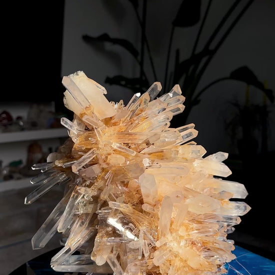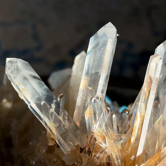 Extra Rare Formation!! This mine is currently closed, therefore a specimen like this one is extremely rare. You have never seen a piece like this before! Dramatically long points with intense Blue Smoke (Cookeite) inclusions and well defined phantom inclusions near the termination of each crystal point. A combination between super thin and thick points. The back of the cluster is fully self healed with this elestial Golden Healer Crystals.