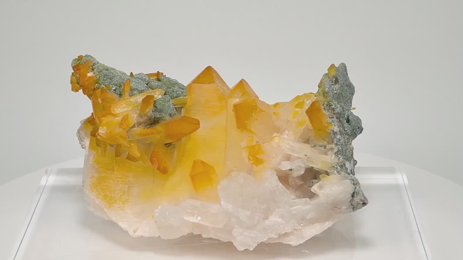 A breathtaking Lemurian Quartz formation of water clear points naturally covered with an iridescent iron oxide layer and shimmery fuchsite.