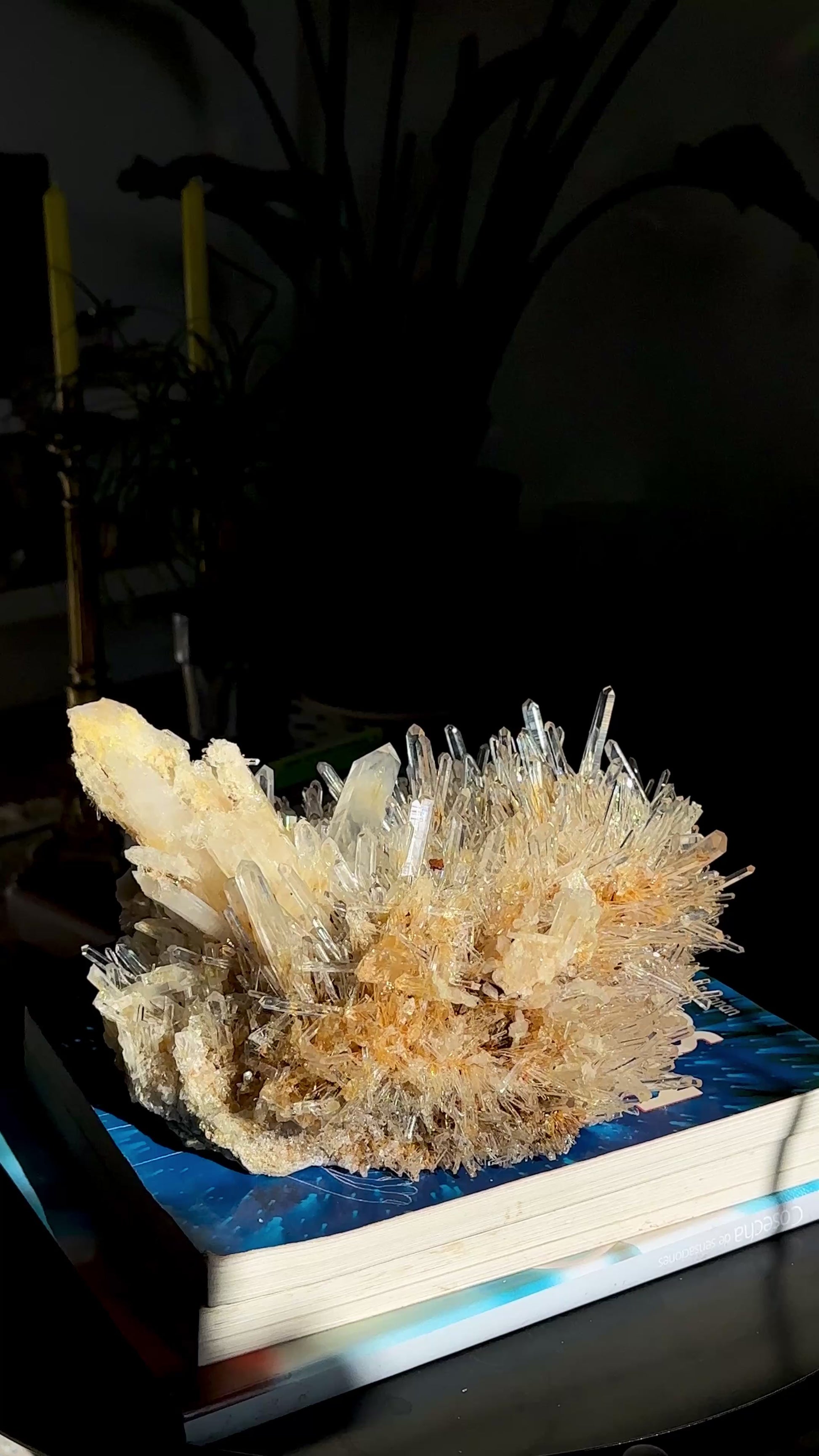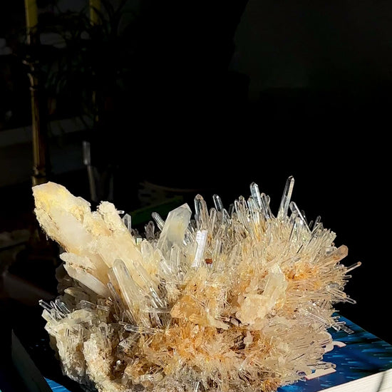 Extra Aesthetic Formation! This mine is currently closed, therefore a specimen like this one is extremely rare. Extra long water clear Needle Lemurian Quartz crystals with blue smoke inclusions and a Golden Healer base (limonite).