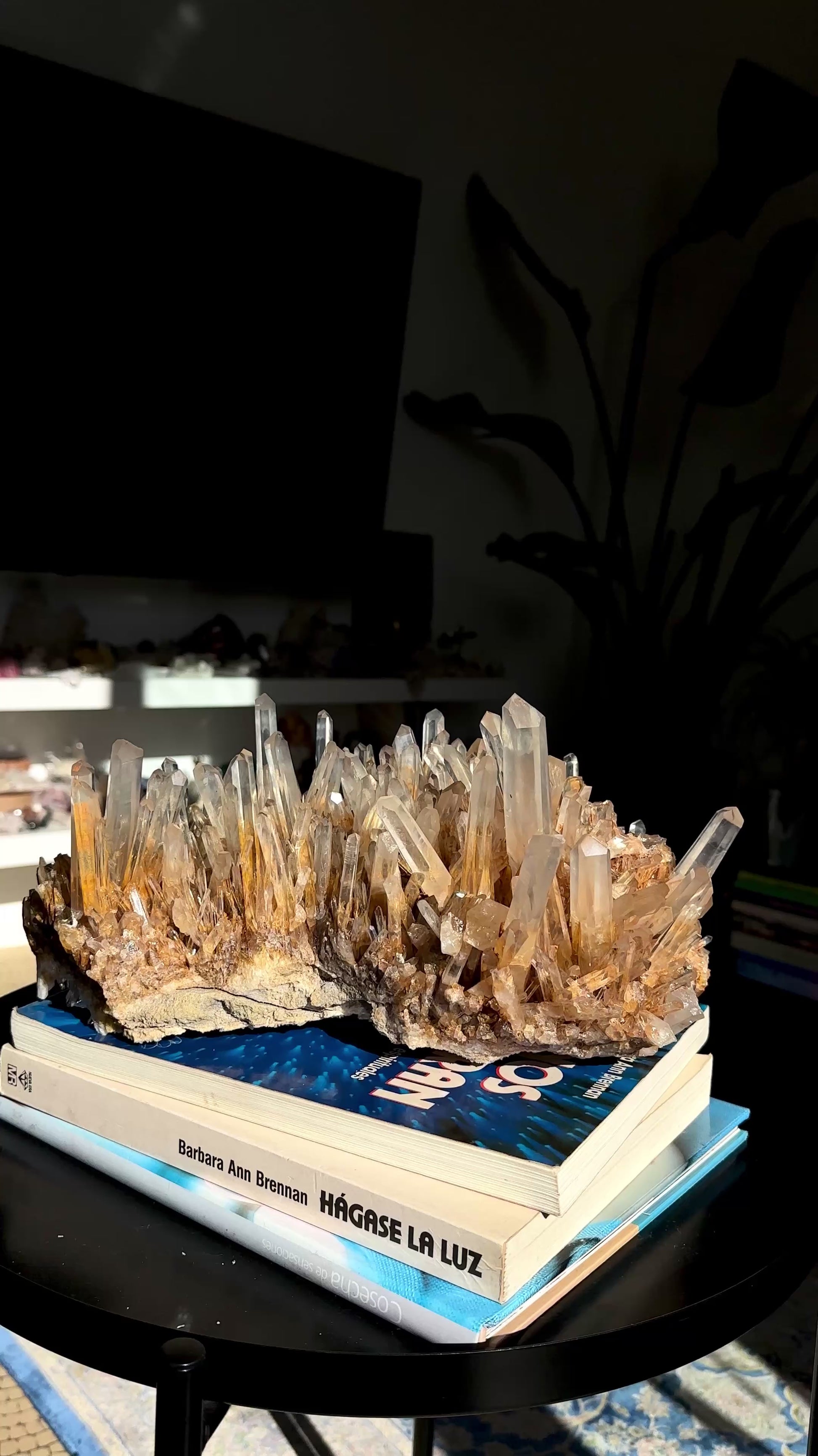 Extra Aesthetic Formation! This mine is currently closed, therefore a specimen like this one is extremely rare. Extra long water clear Needle Lemurian Quartz crystals with blue smoke inclusions and a Golden Healer base (limonite).