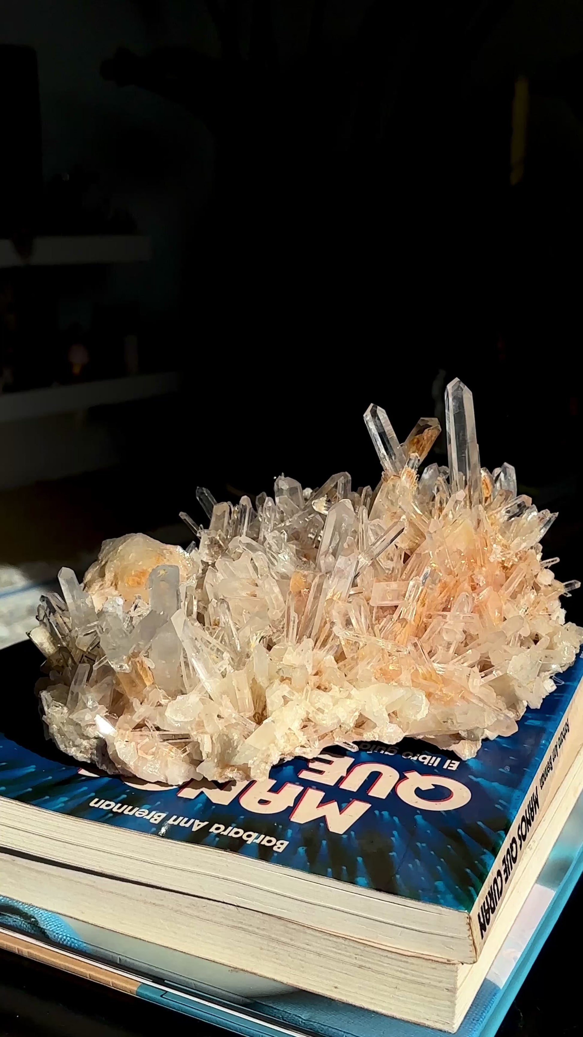 Extra Aesthetic Formation! This mine is currently closed, therefore a specimen like this one is extremely rare. Extra long water clear Needle Lemurian Quartz crystals with blue smoke inclusions and a Golden Healer base (limonite).