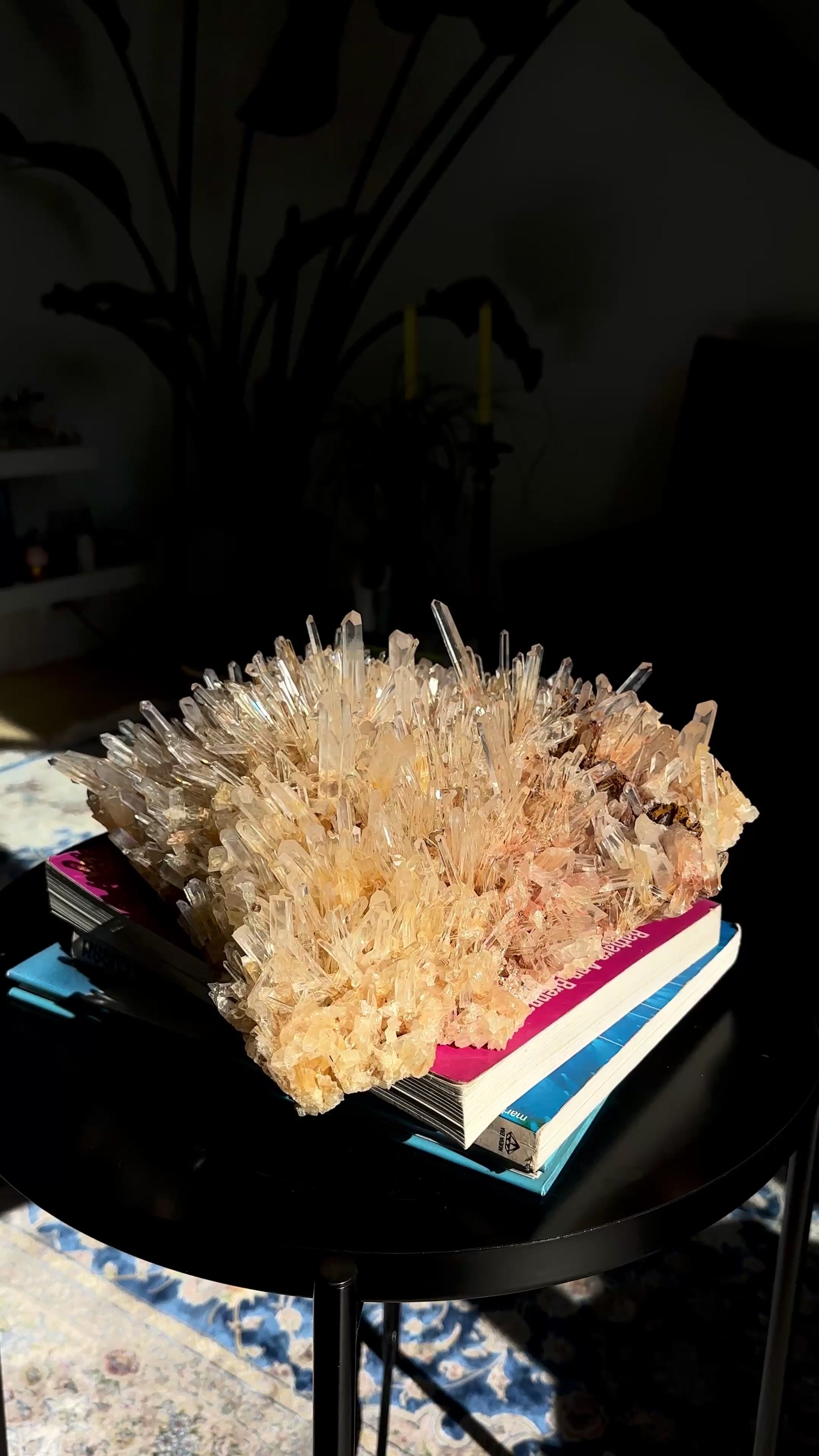 Extra Aesthetic Formation! This mine is currently closed, therefore a specimen like this one is extremely rare. Extra long water clear Needle Lemurian Quartz crystals with blue smoke inclusions and a Golden Healer base (limonite).