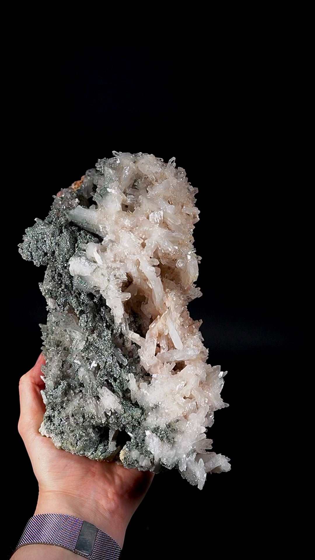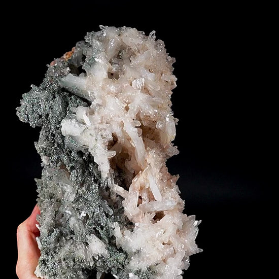 A breathtaking Lemurian Quartz formation of water clear points naturally covered with an iridescent iron oxide layer and shimmery fuchsite.