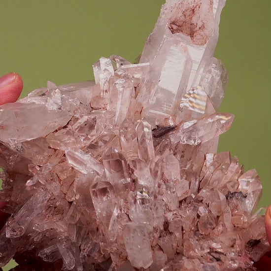 Unlike other Pink Lemurian Quartz Varieties, this new stock features thick, prismatic and super optical points with well defined Lemurian horizontal striations.