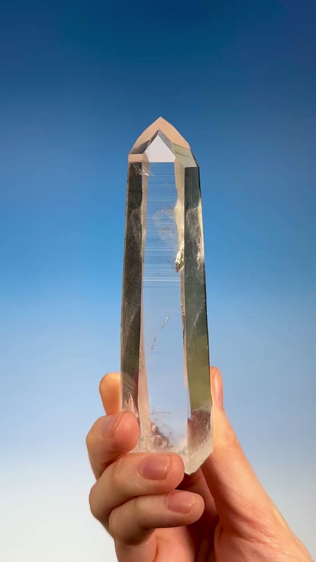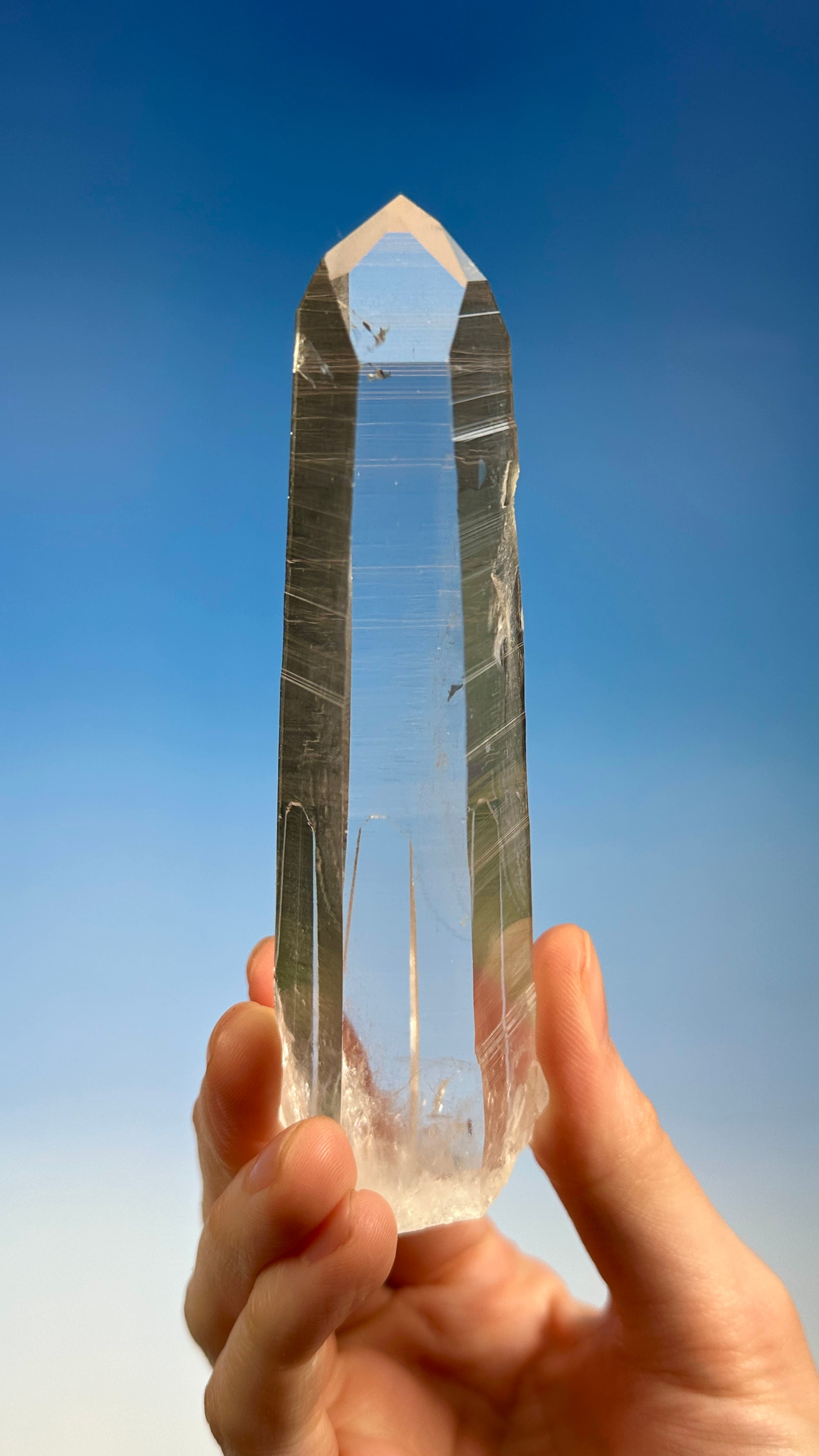 Perfectly symmetrical Temple Heart Lemurian Quartz wand featuring water-clear transparency and prominent Lemurian striations. This is a rare DOW crystal, easily identified by its unique 3-7-3-7-3-7 termination face sequence, a powerful combination of the Channeling and Transmitter configurations. DOW crystals are highly sought after for their exceptional balance of spiritual insight and energetic transmission, making them ideal tools for advanced meditation and healing work.