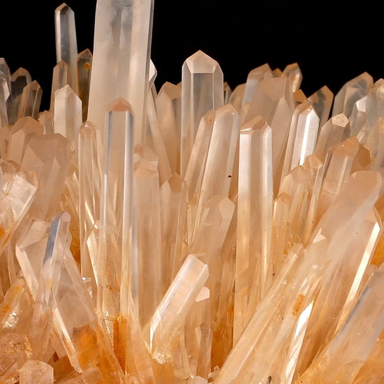 Golden Healer & Super Optical Lemurian Quartz Crystal Clusters featuring thin, elongated terminations — also known as Needle Crystals.